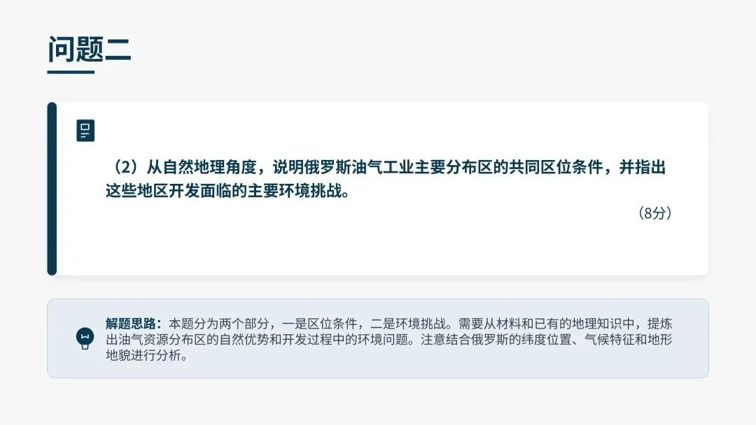 (2)从自然地理角度,说明俄罗斯油气工业主要分布区的共同区位条件,并指出这些地区开发面临的主要环境挑战。(8分)