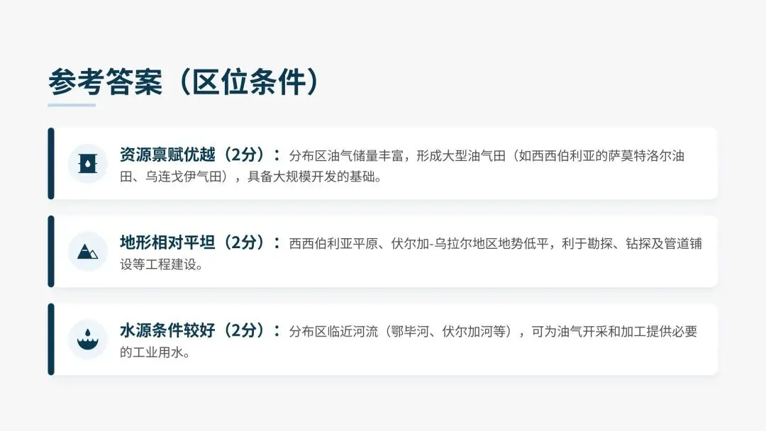 3️⃣水源条件较好:分布区临近河流(鄂毕河、伏尔加河等),可为油气开采和加工提供必要的工业用水。(2分)