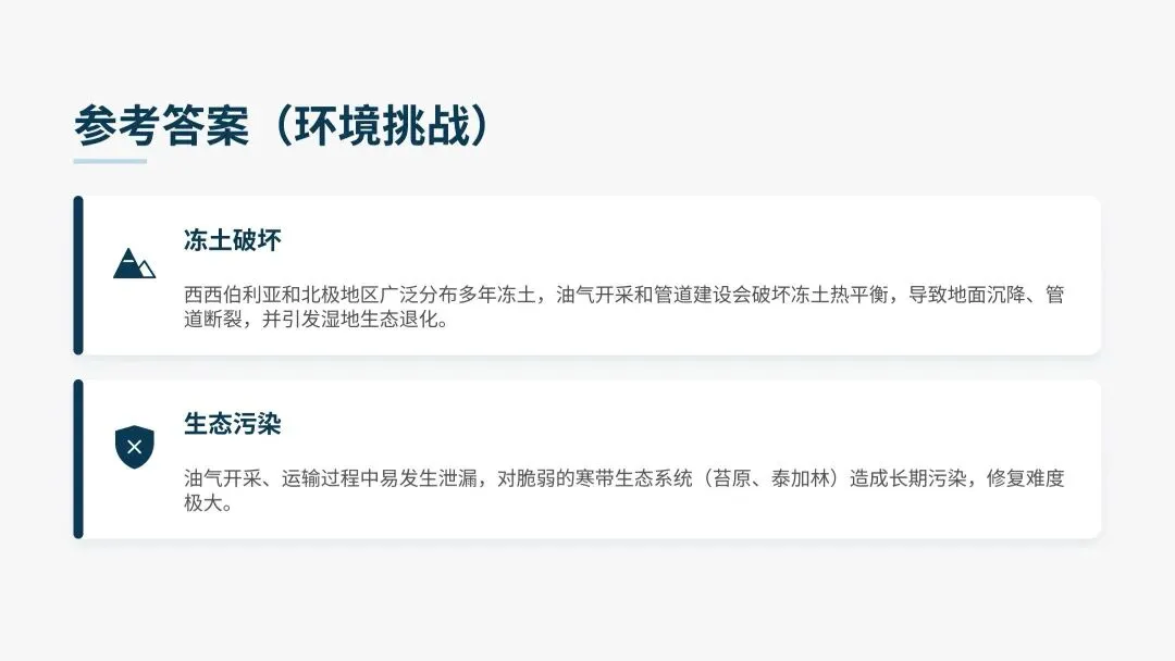 2️⃣油气开采、运输过程中易发生泄漏,对脆弱的寒带生态系统(苔原、泰加林)造成长期污染,修复难度极大。(2分)