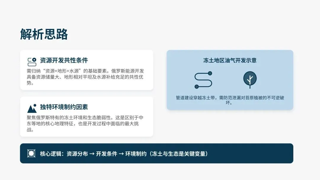 本题考查资源开发的条件与环境制约。前一小问需归纳“资源+地形+水源”的共性;后一小问需聚焦俄罗斯特有的冻土环境和生态脆弱性,这是其能源开发区别于中东等地的核心地理特征。