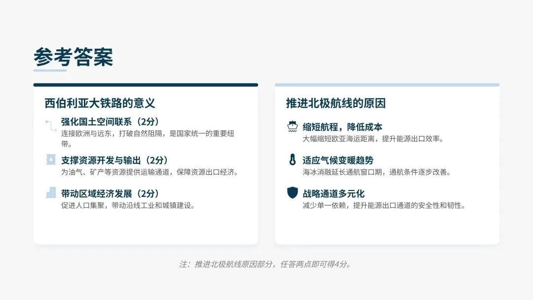 2️⃣支撑资源开发与输出:为沿线油气、木材、矿产等资源开发提供运输通道,是俄罗斯“资源出口型”经济的生命线。(2分)