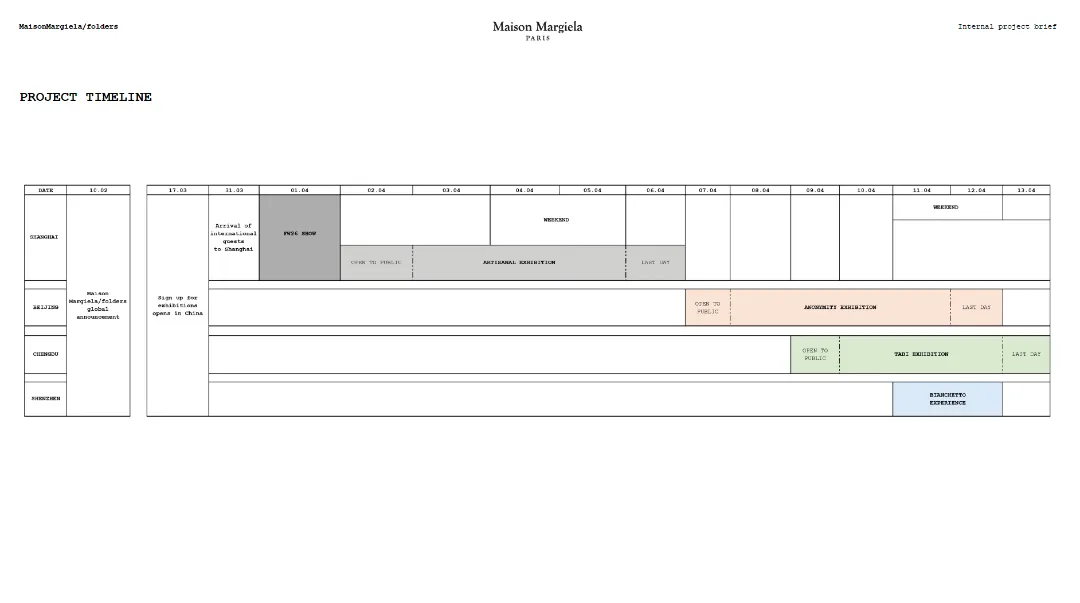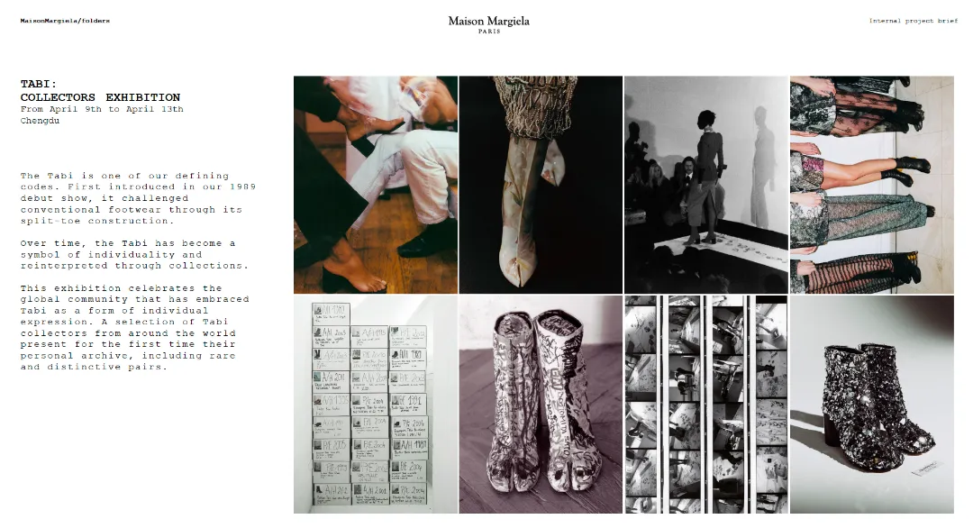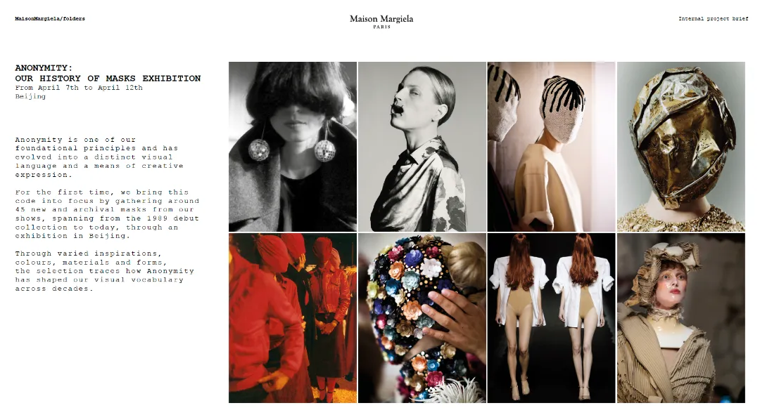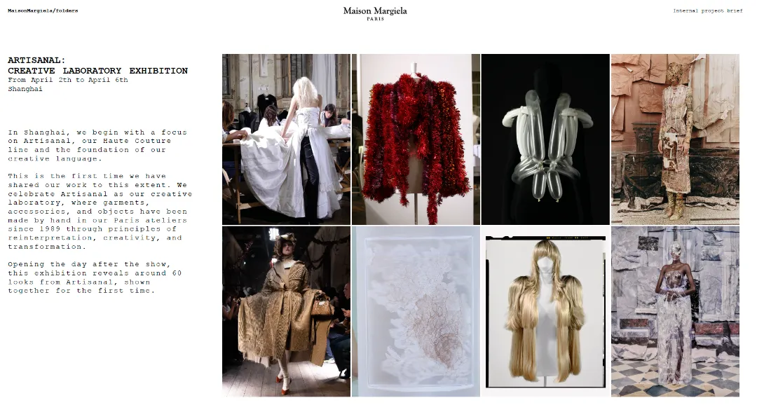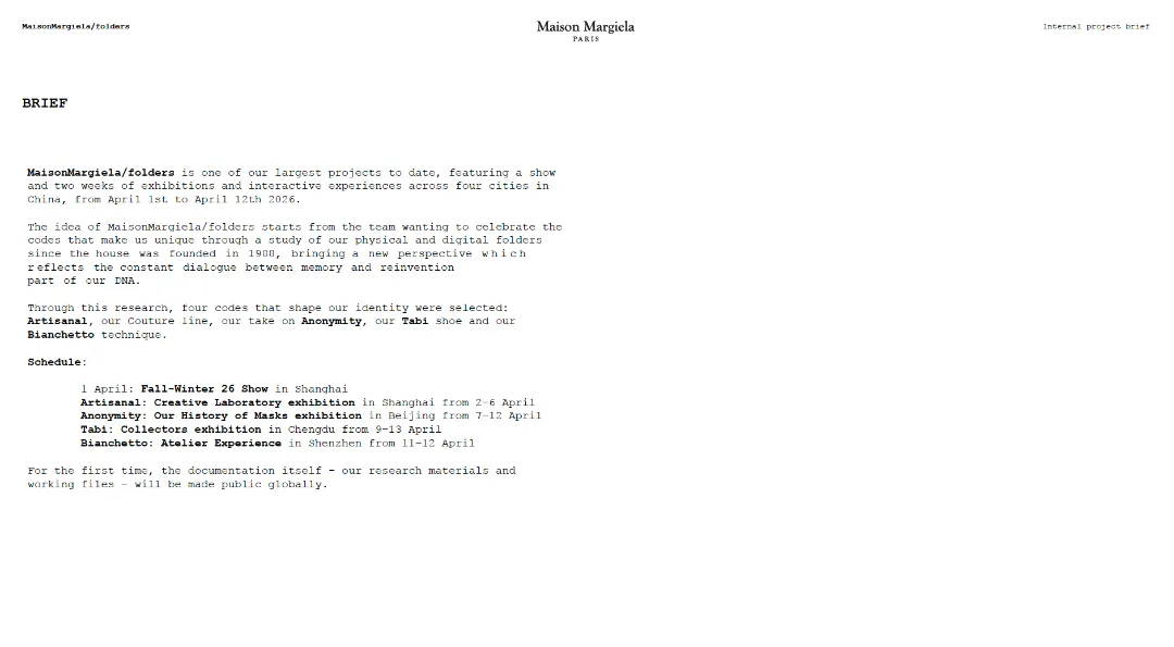 Maison Margiela将这次folders项目从研究到执行的全过程,转化为公众可进入的内容。包含了图像、影像、项目时间表、新闻稿、研究材料与工作文件。而其中出现的资料覆盖了从创作研究初期到展览呈现的完整路径。还纳入自1988年以来的档案材料。于是,公众看到的已经不是一组“幕后花絮”,而是一套仍在运作中的工作系统。