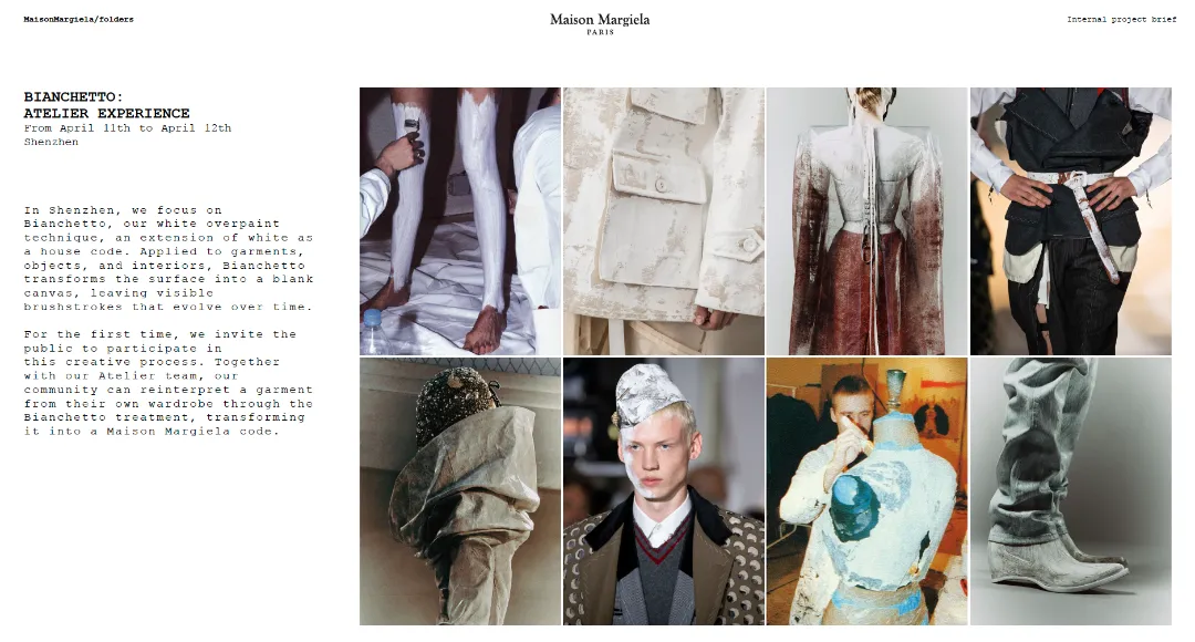 深圳,Bianchetto——white overpaint technique,也就是白色覆盖漆工艺。它处理的不只是表面,更关乎表面与时间的关系。涂层覆盖之后,磨损、裂纹、使用痕迹会缓慢浮现,像一次延迟显影。此次工作坊首次邀请公众带着自己的衣物进入这一过程,Maison Margiela的code 因而从成品层面转入经验层面,成为一种可以被触发的方法。