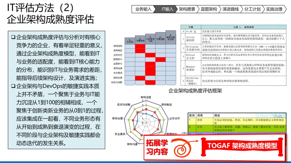 演进路线设计:通过差距分析识别现状与蓝图的差异,按可行性、业务影响、优先级排序关键任务,组合形成项目群,分阶段推进架构落地,平衡短期成效与长期价值。
