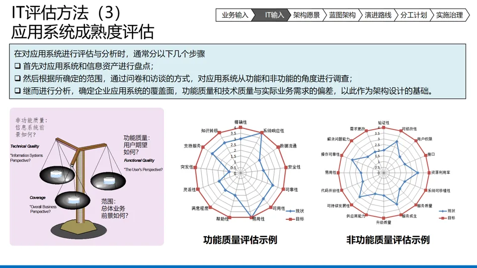 架构规划维度:涵盖应用架构、数据架构、技术架构、基础设施架构、运维架构、安全架构六大核心领域,通过业务建模、现状评估、蓝图设计、演进路线规划四步流程,实现从现状到目标架构的平滑过渡。