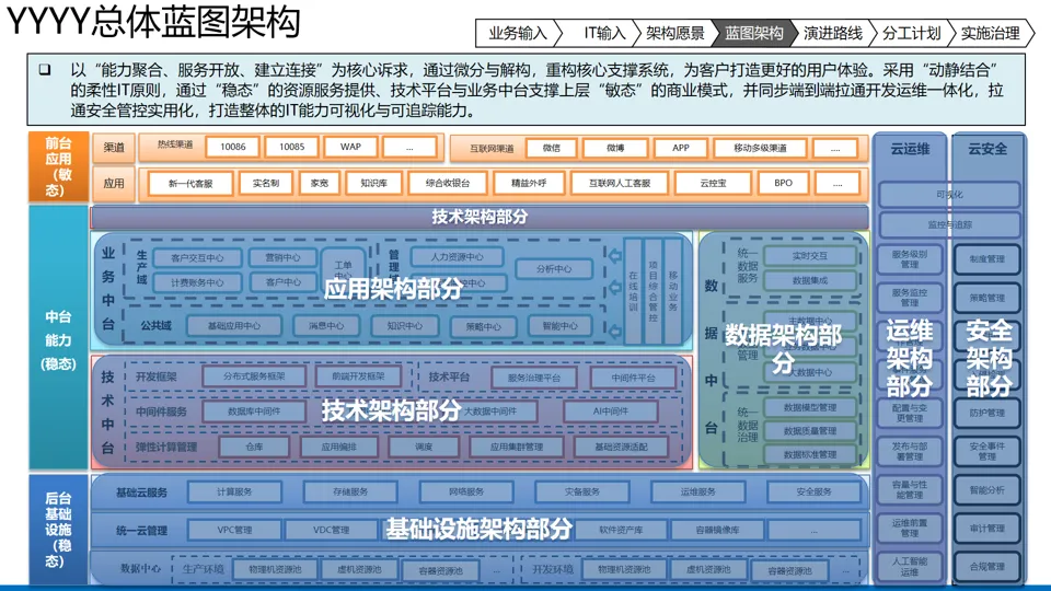 核心原则:坚持业务与 IT 融合,以业务战略为导向,兼顾稳态业务的稳定性与敏态业务的敏捷性,实现 “动静结合” 的柔性 IT 架构建设。