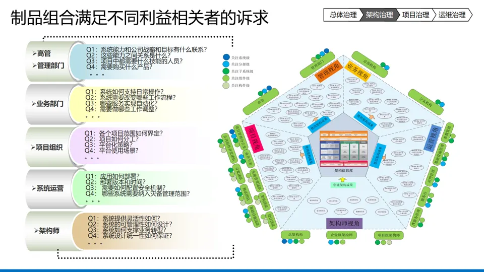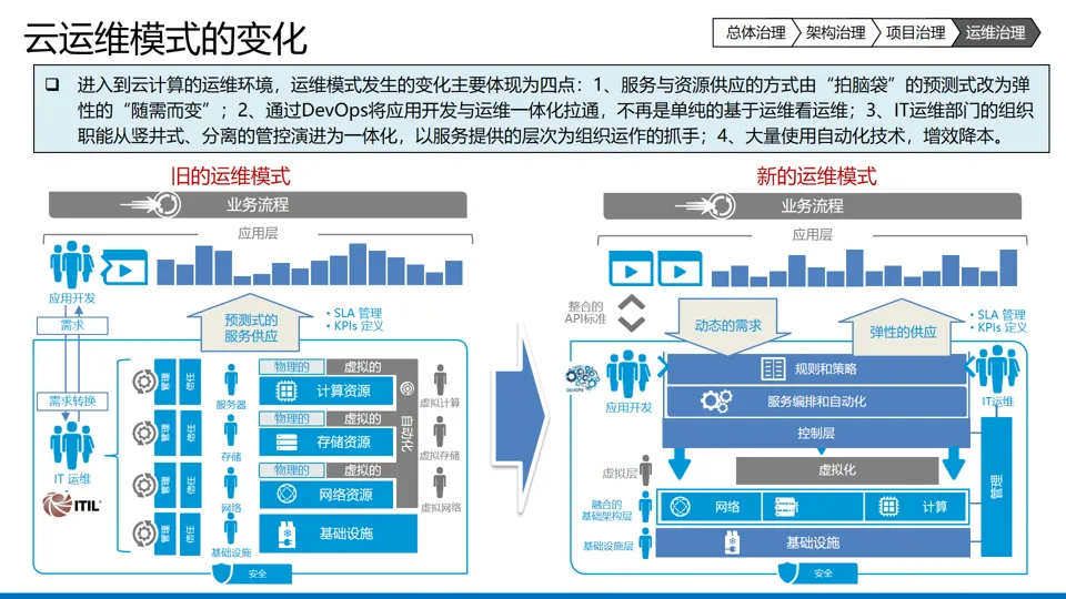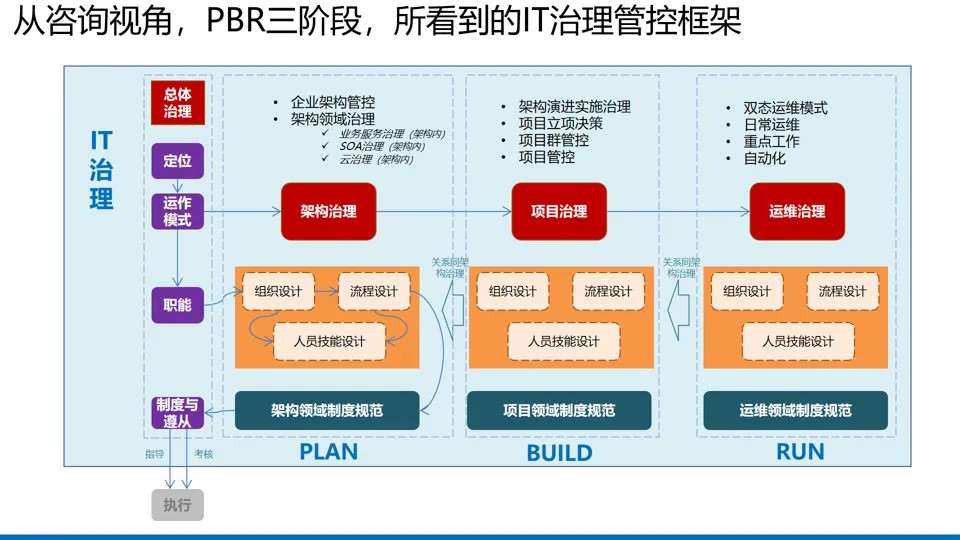 细分领域治理:架构治理聚焦架构资产管控与标准规范制定,通过架构契约保障实施一致性;项目治理区分稳态与敏态项目,采用差异化决策流程,强化项目群管控与价值跟踪;运维治理适应云运维模式变化,推进例行操作标准化与自动化,构建 “部署流水线 – 监控告警 – 故障处置 – 性能优化” 全流程管控。
