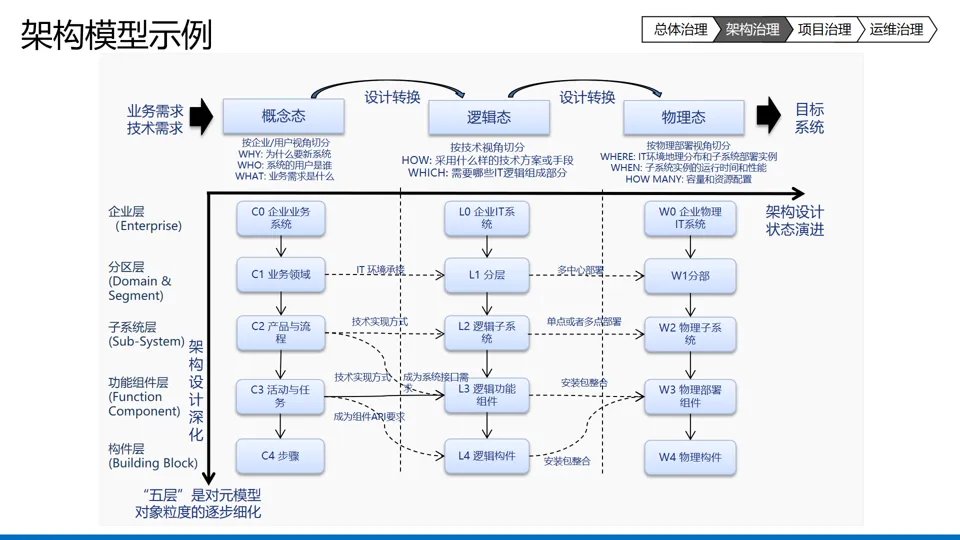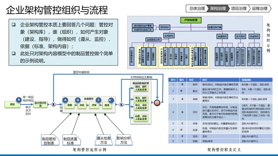 核心框架:构建 “总体治理 + 架构治理 + 项目治理 + 运维治理” 四层治理体系,覆盖规划与计划、设计与构建、运营与运维全生命周期,通过组织设计、流程规范、人员赋能实现治理落地。