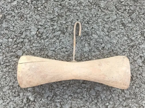 这个东西叫拨楞锤子,有的人喊纺线锤,牛骨头打磨出来,中间打眼挂着一根大铁钩,主要是搓麻绳的,拨一圈线,手上得快,不然轴没转明白跟着线就缠胡了,弄不好麻线崩弹到手上,疼得直喊娘。