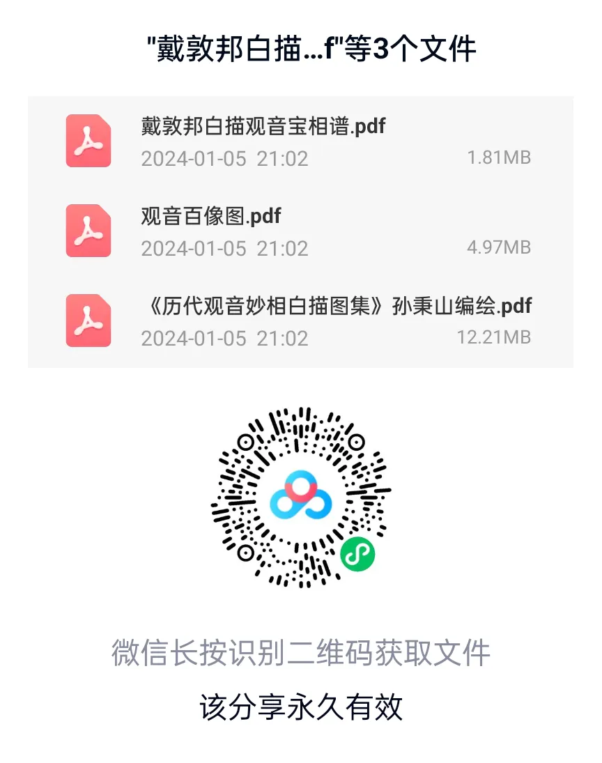 今天分享三个关于观世音菩萨的PDF文档,分别是《戴敦邦白描观音宝相谱》,《观音百像图》,《历代观音妙相白描图集,孙秉山编绘》。里面有些图我觉得还可以。分享给大家。