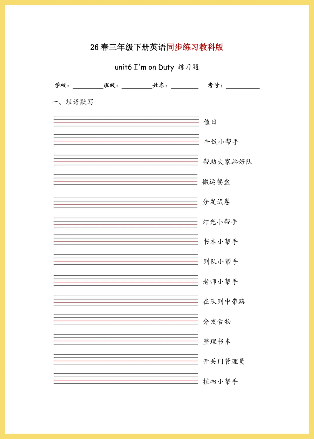 【免费下载】三年级(下)英语_Unit6_I’m_on_Duty(同步练)《教科版》 | PDF完整高清电子版可打印