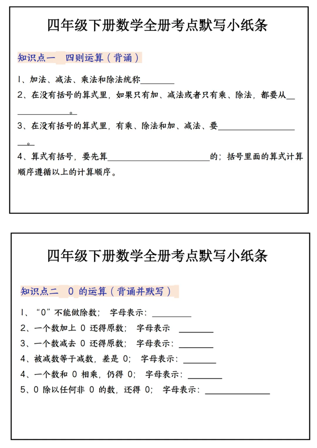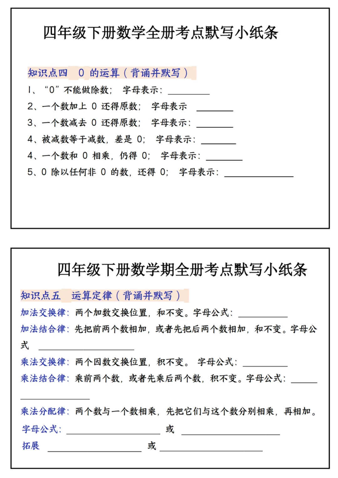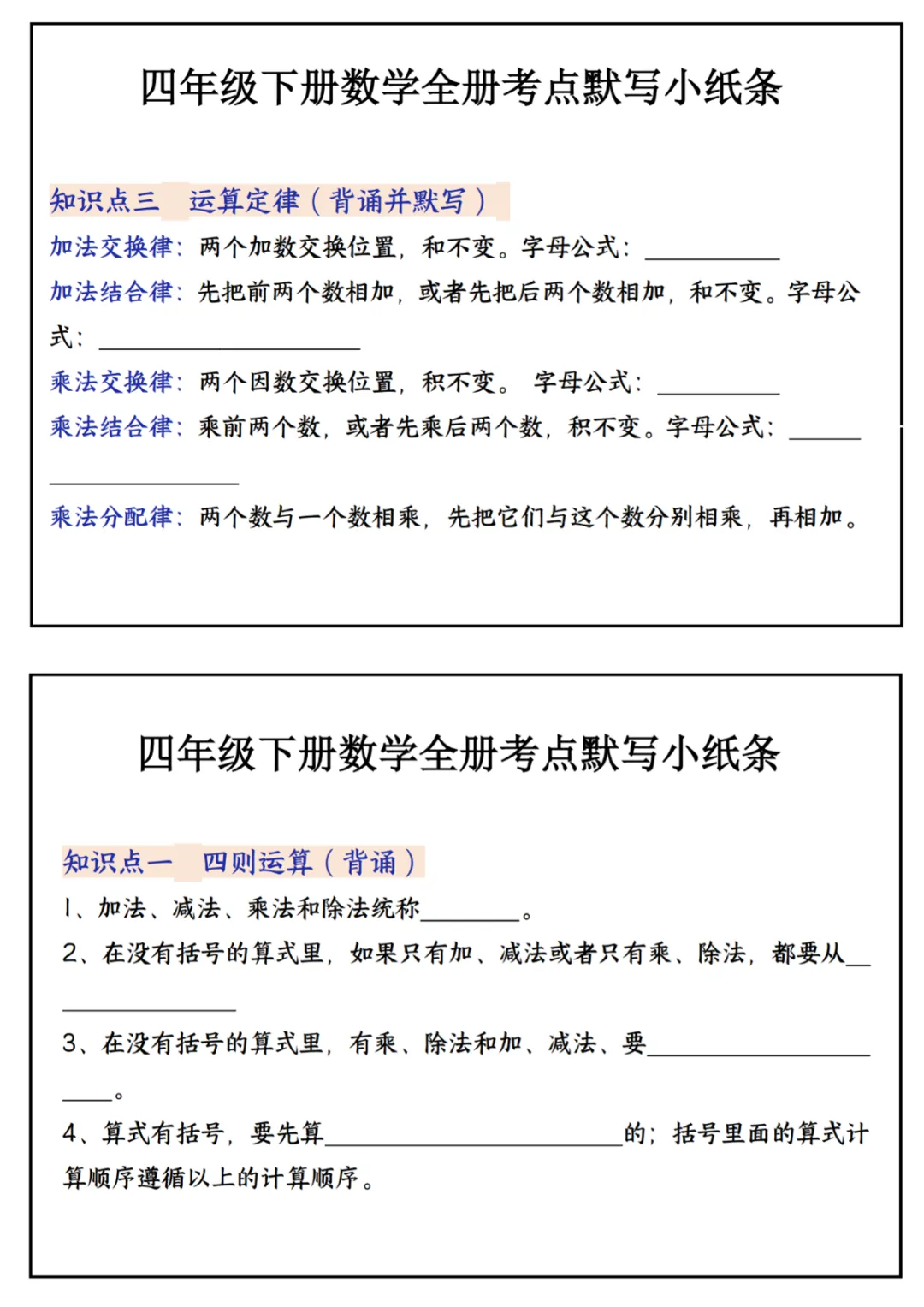 【高清电子版】四(下)数学必背知识点默写小纸条22页