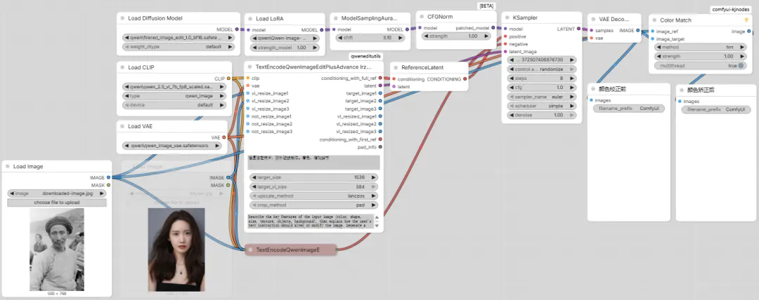 说明:这是 FireRed-Image-Edit-1.0 的工作流,与 2511 的工作流类似,增加了 Color Match 节点(使用 hm method),用于色彩矫正(发现部分场景局部编辑后会导致整体画面色彩发生变化,可以酌情打开)。