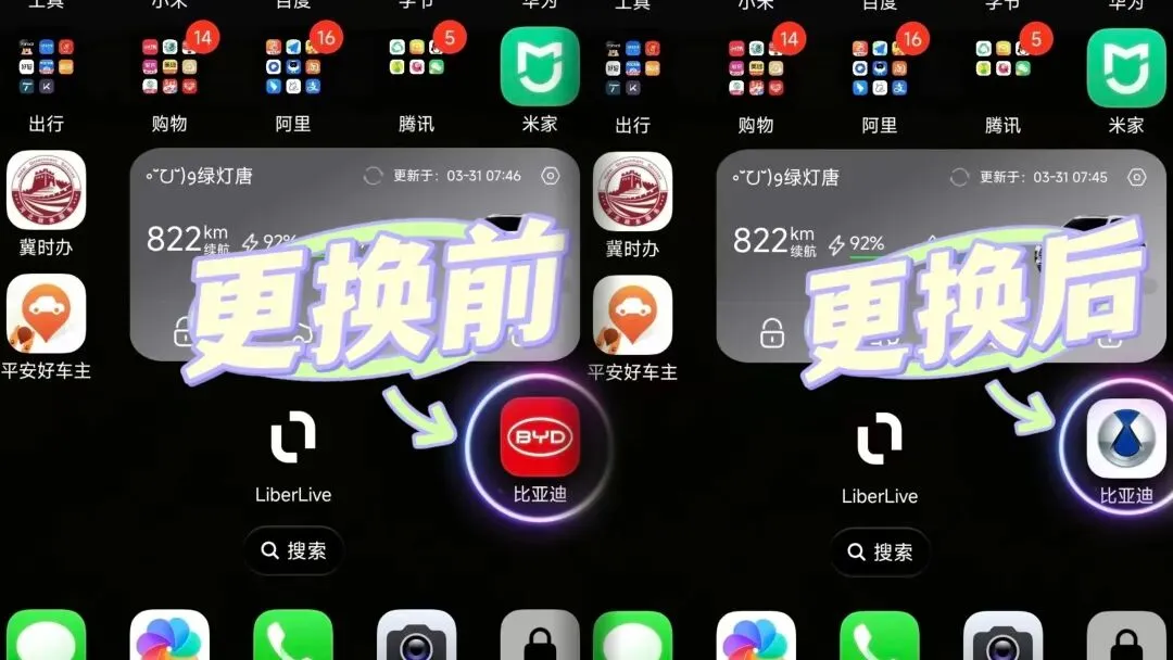 以前,无论你是开汉EV的,还是开海豚的,桌面上那个的“BYD”图标永远不变。现在不一样了,比亚迪把选择权交给了大家,让你的手机桌面从此告别单调。