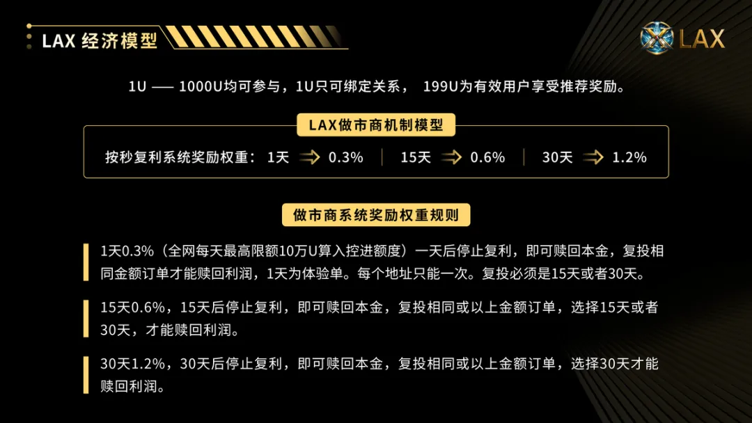 • 结算规则:静态用户赎回做市商订单并复投时,立即为上属结算对应动态收益。
