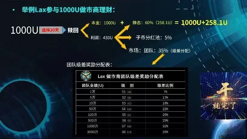 • 动态收益来源:全部来自静态收益的35%(即用户理论静态收益100U时,实际仅得60U,剩余40U分配给子币池及团队S1-S8成员)。