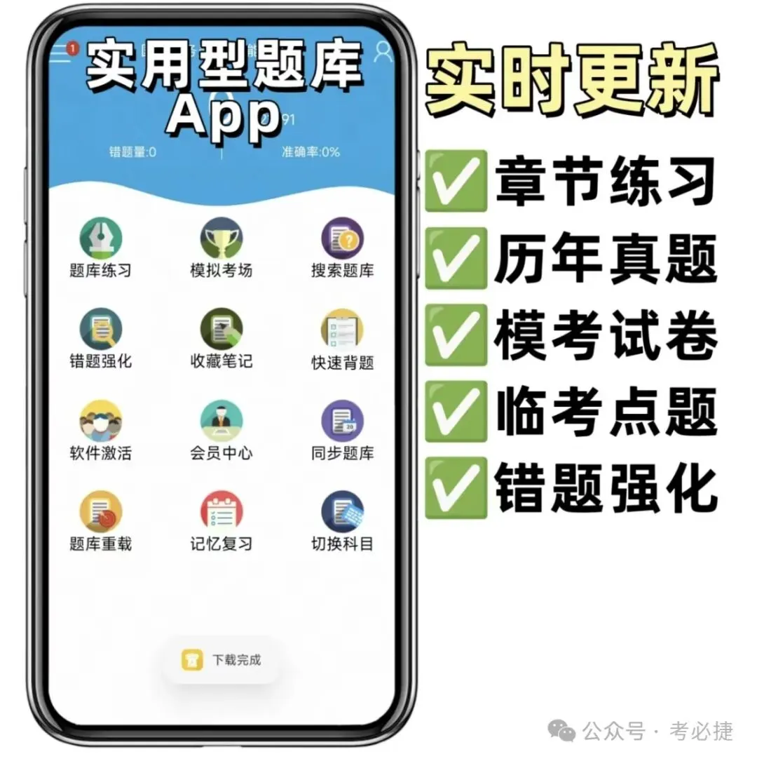 快题库作为老牌刷题软件,纯免费,性价比很高。它的刷题功能主要有每日一练、章节练习、真题模考、周周测、月考、万人模考等。不过,由于公司主要授课,软件在交互和题库更新方面可能会稍显不足。如果有上课意愿的考生,可以选择刷题与课程结合,在快题库进行练习。