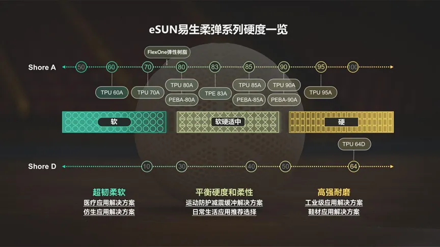 TPU系列线材包含8个类别,覆盖多硬度区间(如70A、80A、64D等),该系列材料具备良好的柔韧性与耐磨性能,适用于柔性结构件、保护套及功能性部件打印。