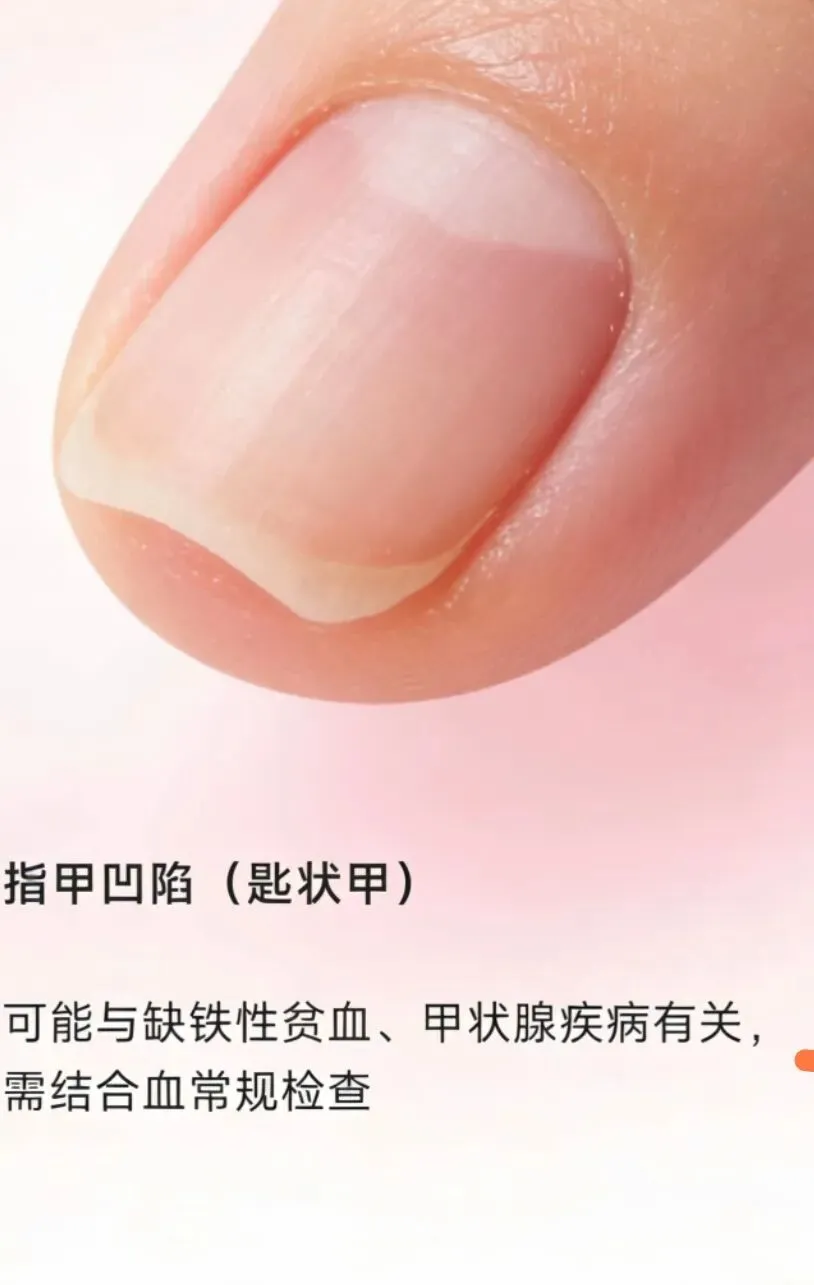 指甲凹陷(匙状甲):指甲中间凹陷,边缘翘起,像个小勺子。这可能与缺铁性贫血、甲状腺疾病有关,需结合血常规检查。
