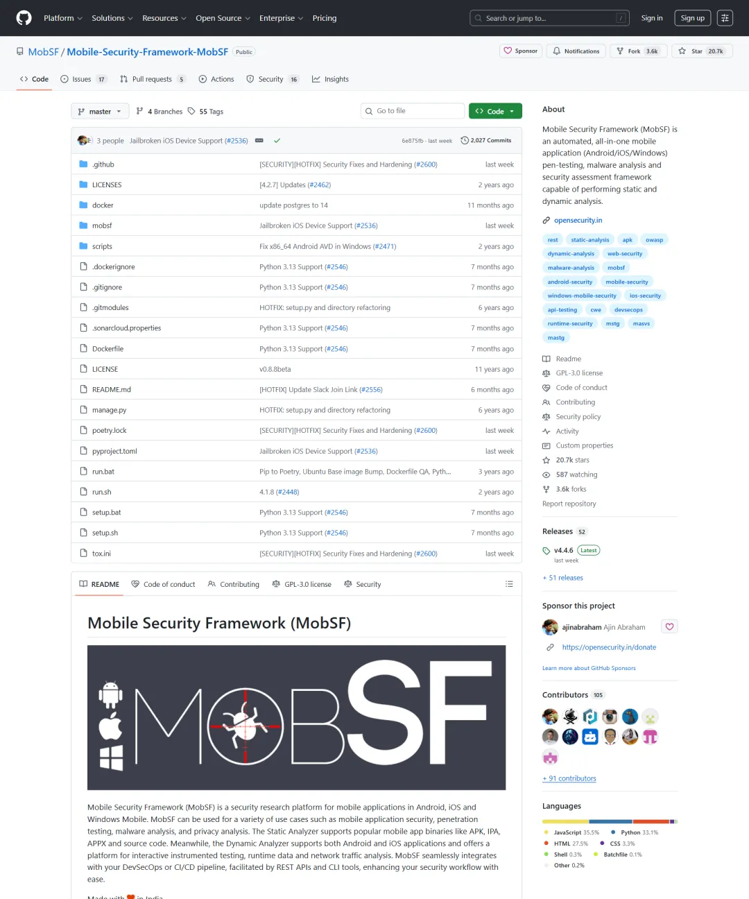 官方仓库首页对 MobSF 的描述其实非常直接:
