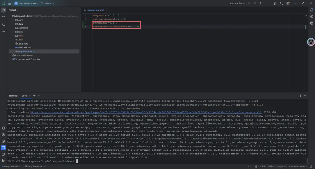 这个功能在之前搭的deepseek-demo工程上只加了两个文件(rag.py和07_rag_qa.py),但能力却提升了一大截——AI不再是“一本正经的胡说八道”,而是“有据可查”了。