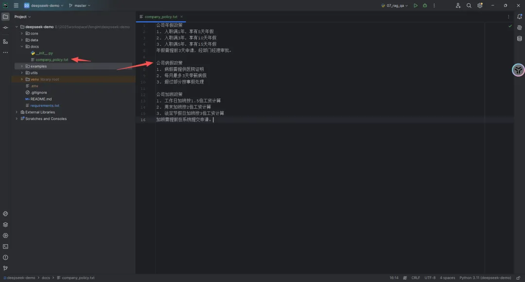 确保docs/company_policy.txt在项目根目录下,不是放在core/或examples/里面。