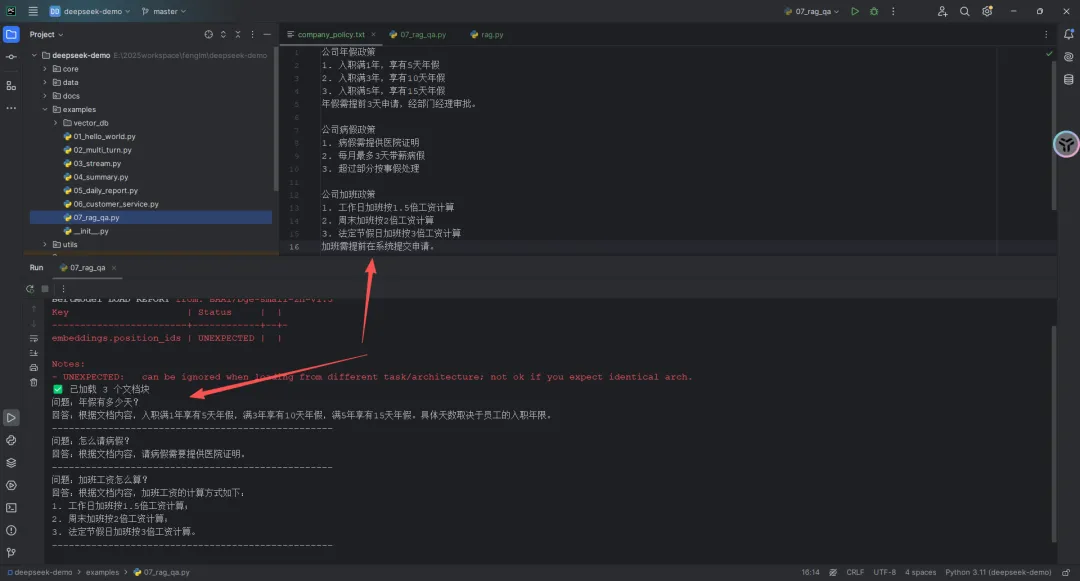 代码写完之后,我在examples/07_rag_qa.py里写了一个测试脚本👇