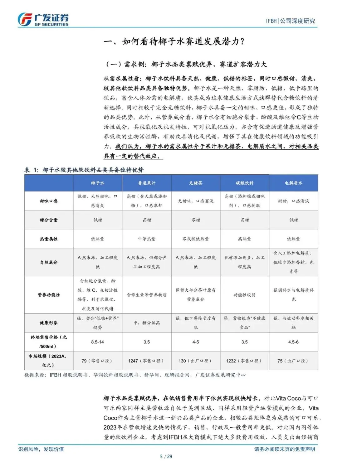 (1)需求侧:椰子水品类禀赋出众,健康化诉求下,预计椰子水未来仍将是软饮料中增速最快的子赛道之一;
