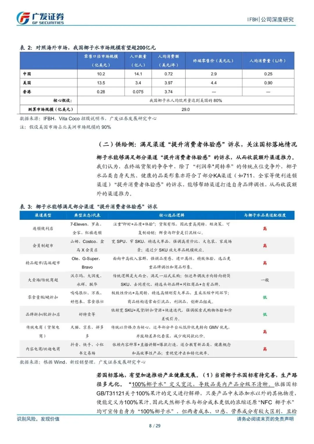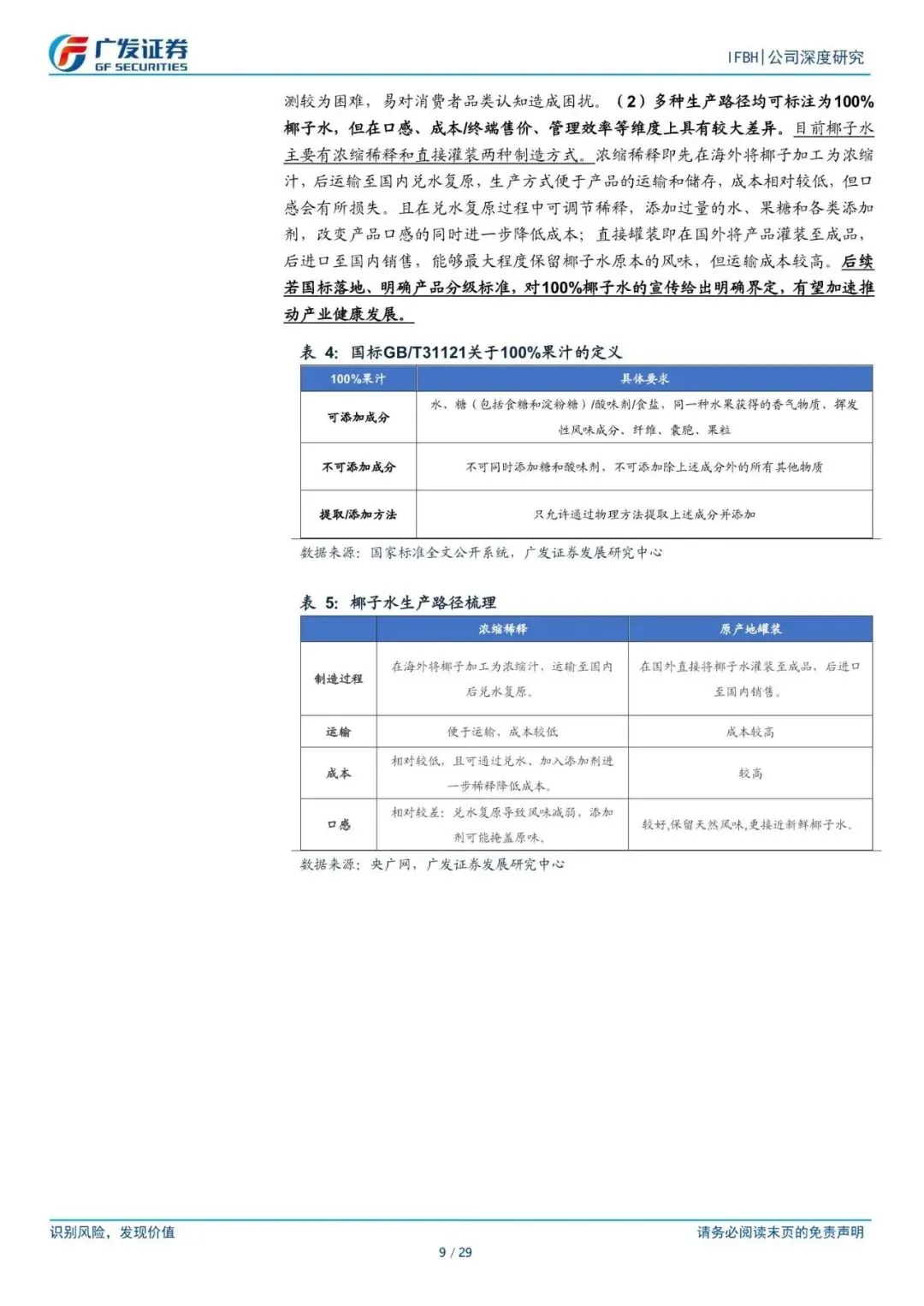 (2)供给侧:椰子水符合渠道端“提升顾客体验感”的诉求,从而形成推力。上游原材料供给可构筑形成差异化口感,后续若国标落地、明确产品分级标准,有望加速推动产业健康发展。