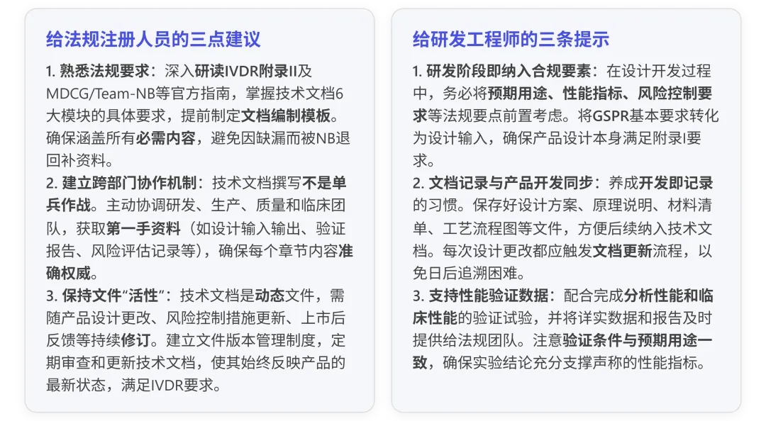 教训:从一开始就确保所有文件的“一致性”非常重要。预期用途(用途)、产品功能宣称和使用说明(IFU)必须保持同步——它们实际上是从不同角度对同一产品的描述,理应完全相符。换言之,技术文档是源头,其中定义的每个细节(用途、规格、性能、风险控制等)都应准确传播到标签、IFU、SSP等外部文件中。任何前后矛盾都会削弱NB对产品合规性的信心,甚至可能导致重新评审或认证失败。
