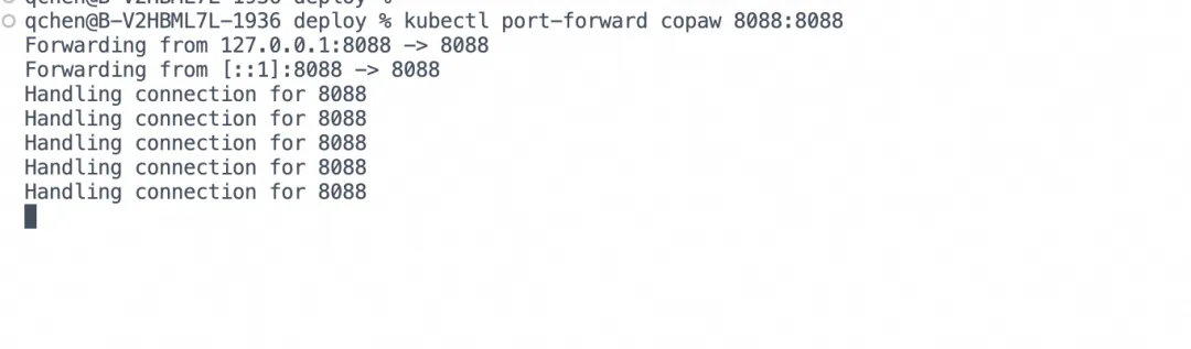 $ kubectl port-forward copaw 8088:8088Forwarding from 127.0.0.1:8088 -> 8088Forwarding from [::1]:8088 -> 8088