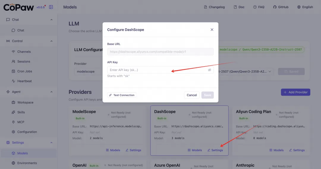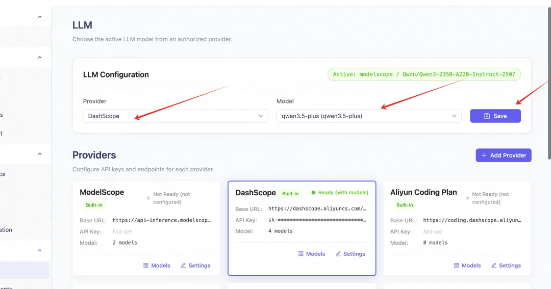 配置云端模型,可以选择modelscope、openai、dashscope、anthropic等多来源,配置完url和api key,选择模型即可使用。