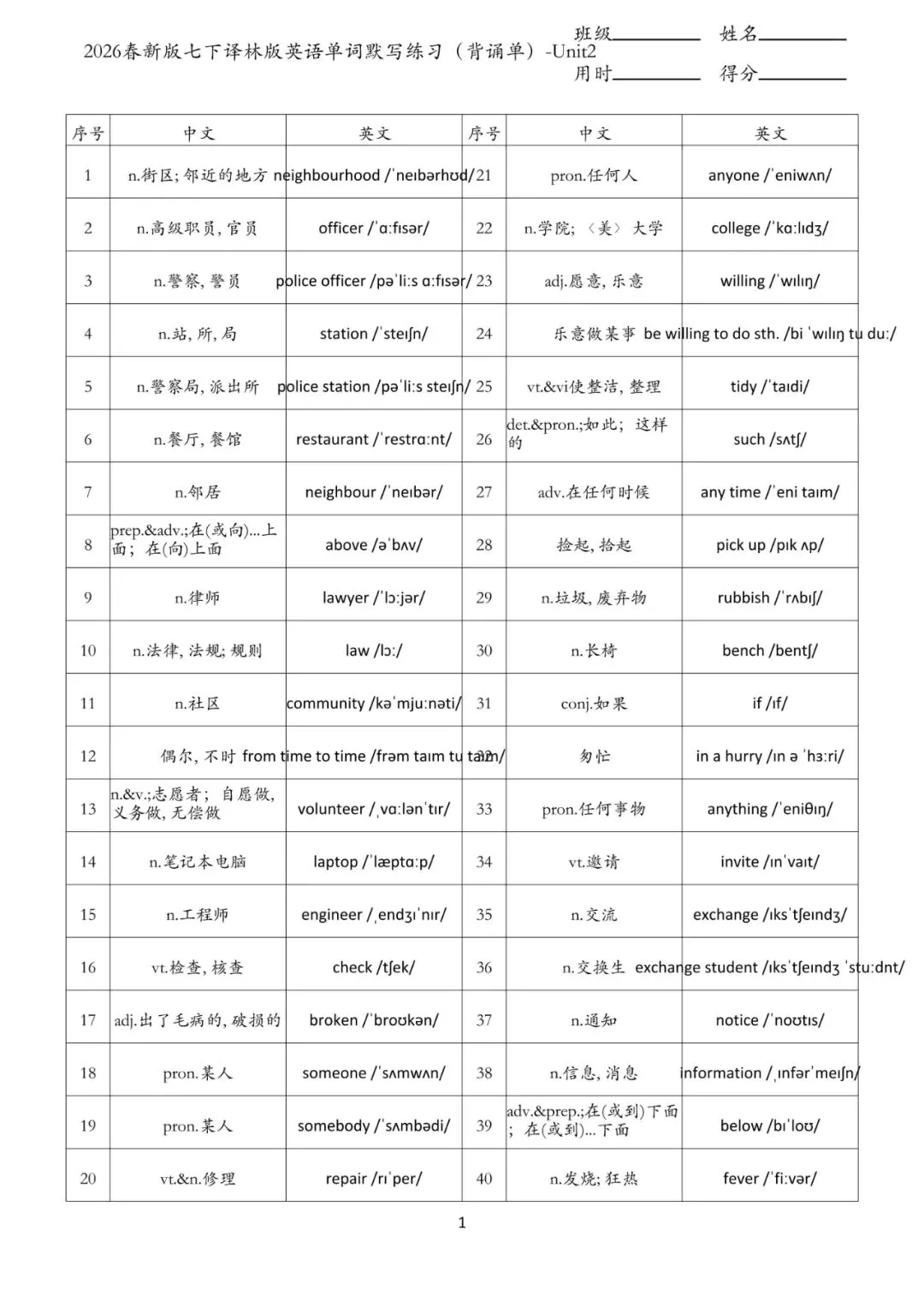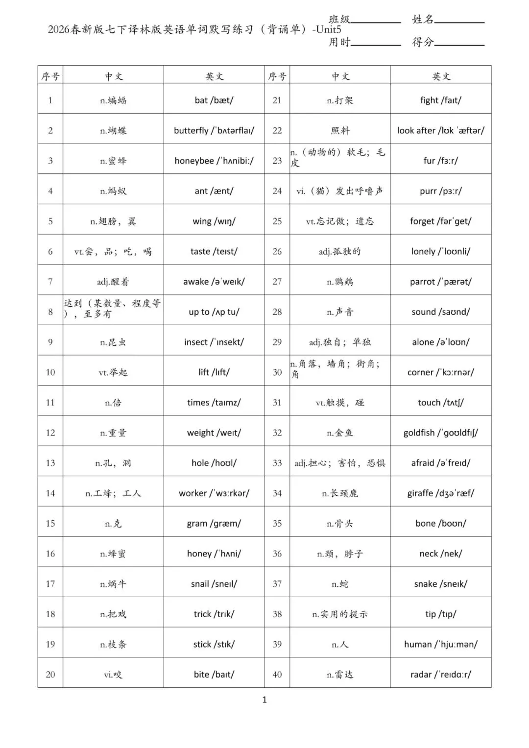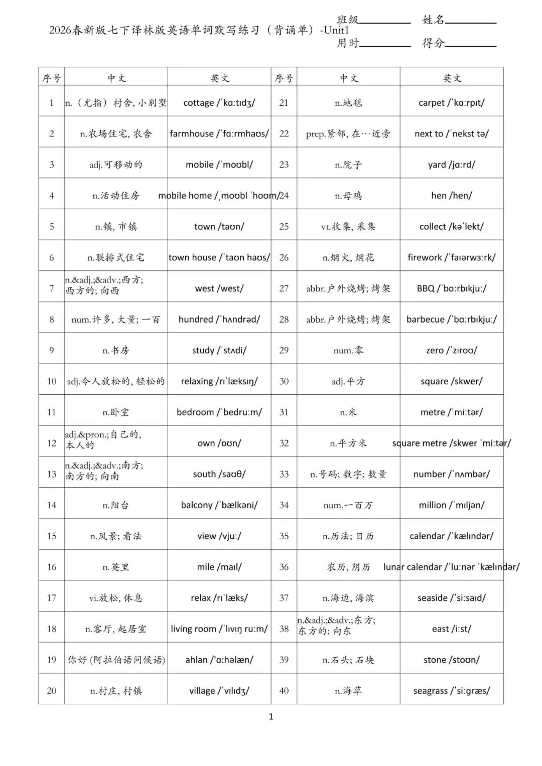 老师给大家整理了:七年级下册 英语 单词默写练习 电子版可打印