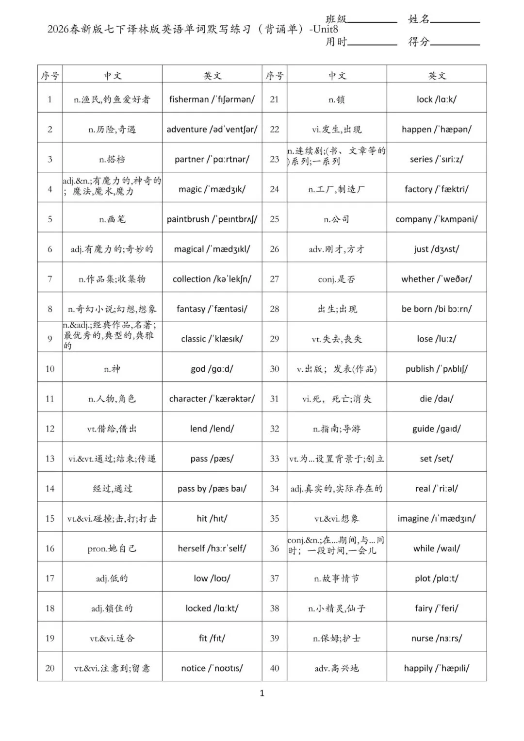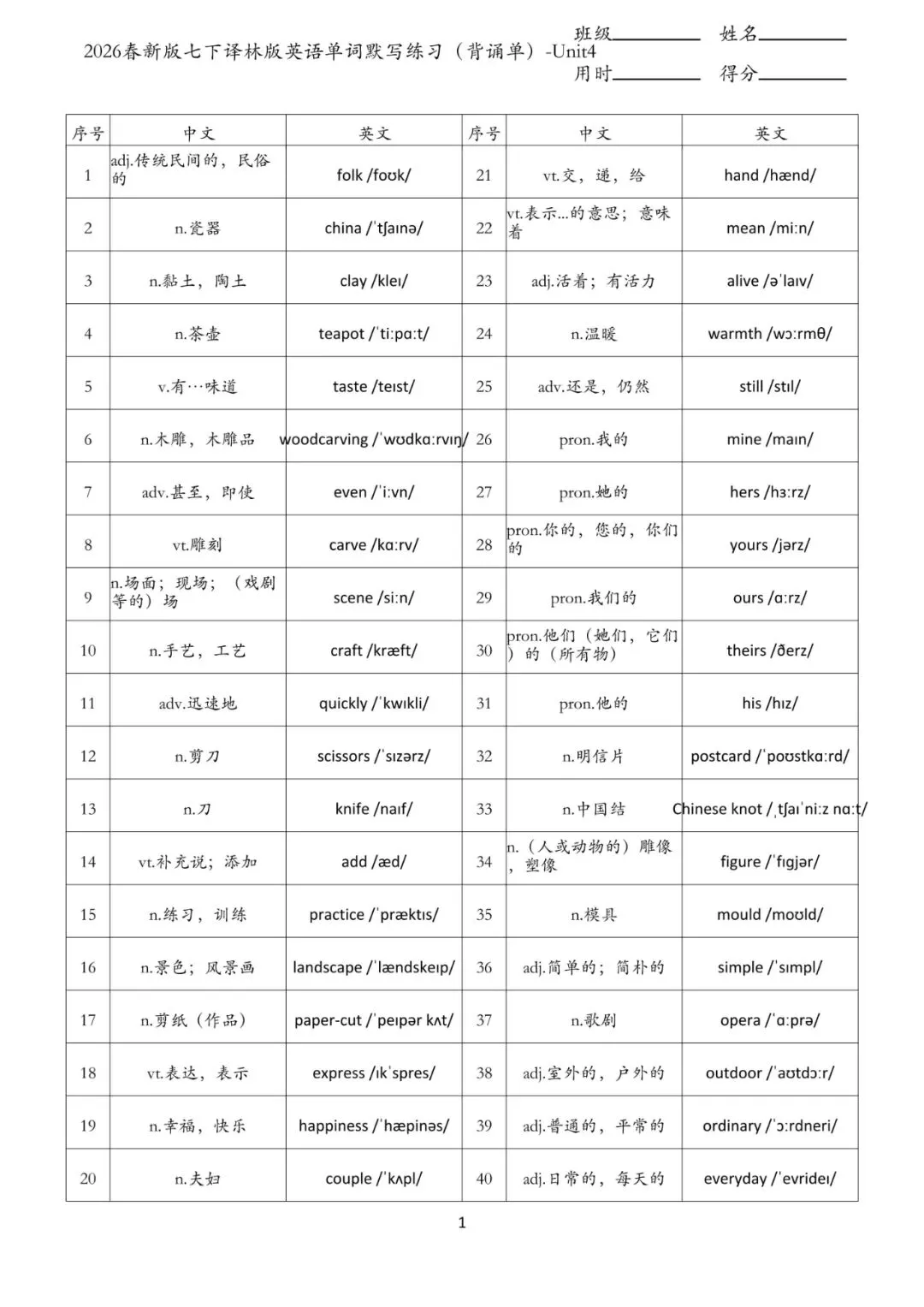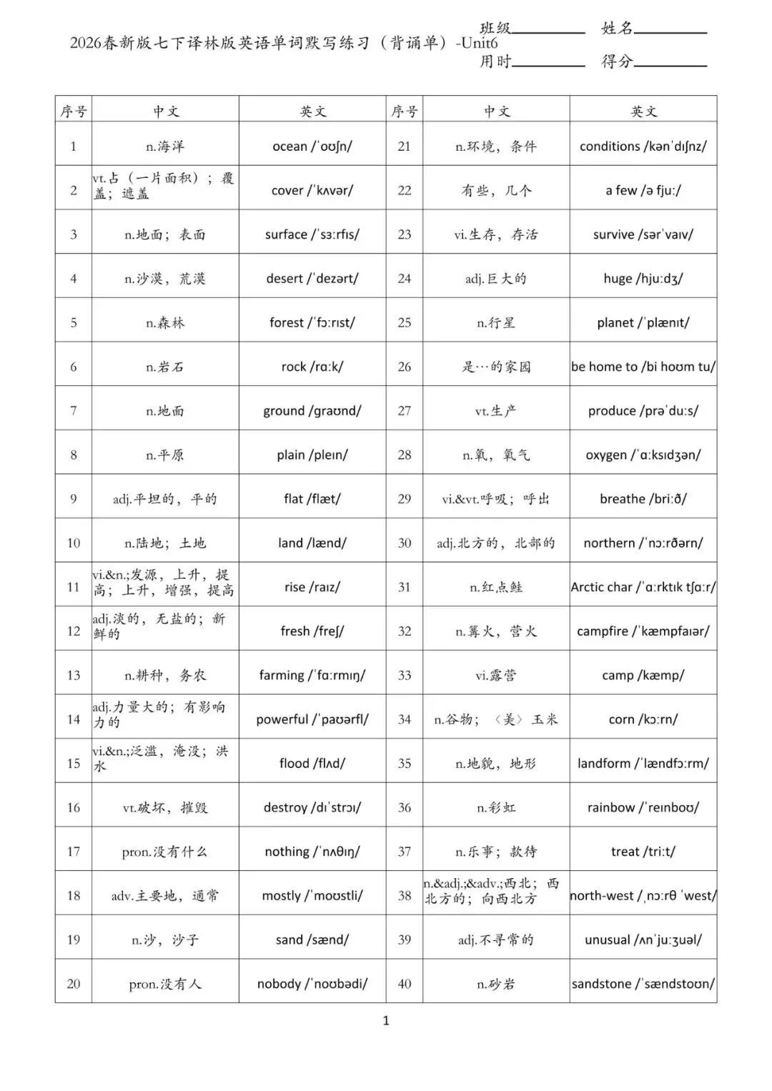 老师给大家整理了:七年级下册 英语 单词默写练习 电子版可打印