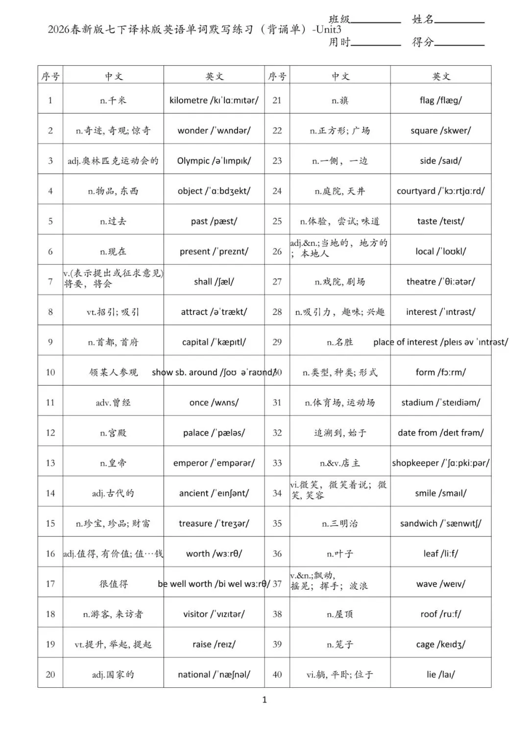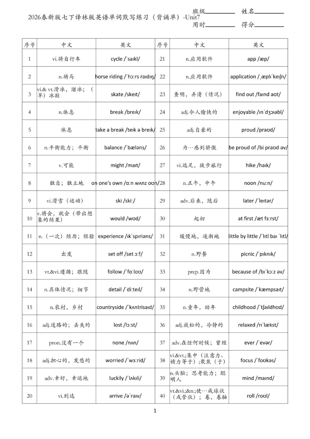 七年级下册 英语 单词默写练习 电子版可打印