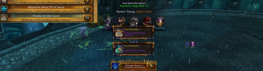 其次是词缀调整优化。在地心之战 S1 中,“萨拉塔斯的狡诈” 词缀从 + 7 层开始便会施加 15 秒限时惩罚,而本赛季这一惩罚被调整至 + 12 层 —— 要知道,+12 层已超出大部分玩家追求的最大奖励范围,多数玩家在 + 10 层便会停止推进,这一调整让中低层钥石的限时压力大幅降低,成为首周限时率飙升的关键原因之一。