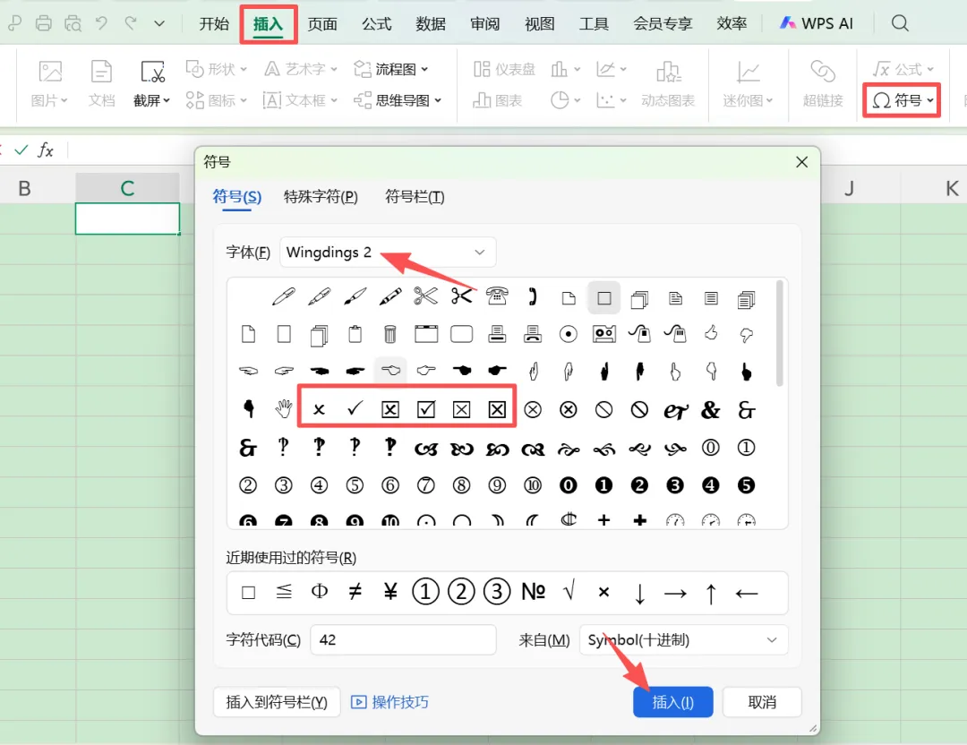 【excel】如何在Excel中打勾、打叉? 点击蓝字 关注我们 【解决步骤】 1、点击需要插入符号的表格框,在顶部菜单栏选择【插入】-【符号】, 2、符号“字体”选择“Wingding2”,对应选择符号,点击【确定】。 📢 如果这篇内容帮到了你,欢迎点赞、转发、推荐支持我! 点赞 收藏 分享