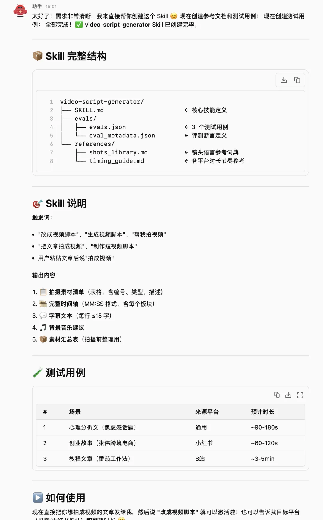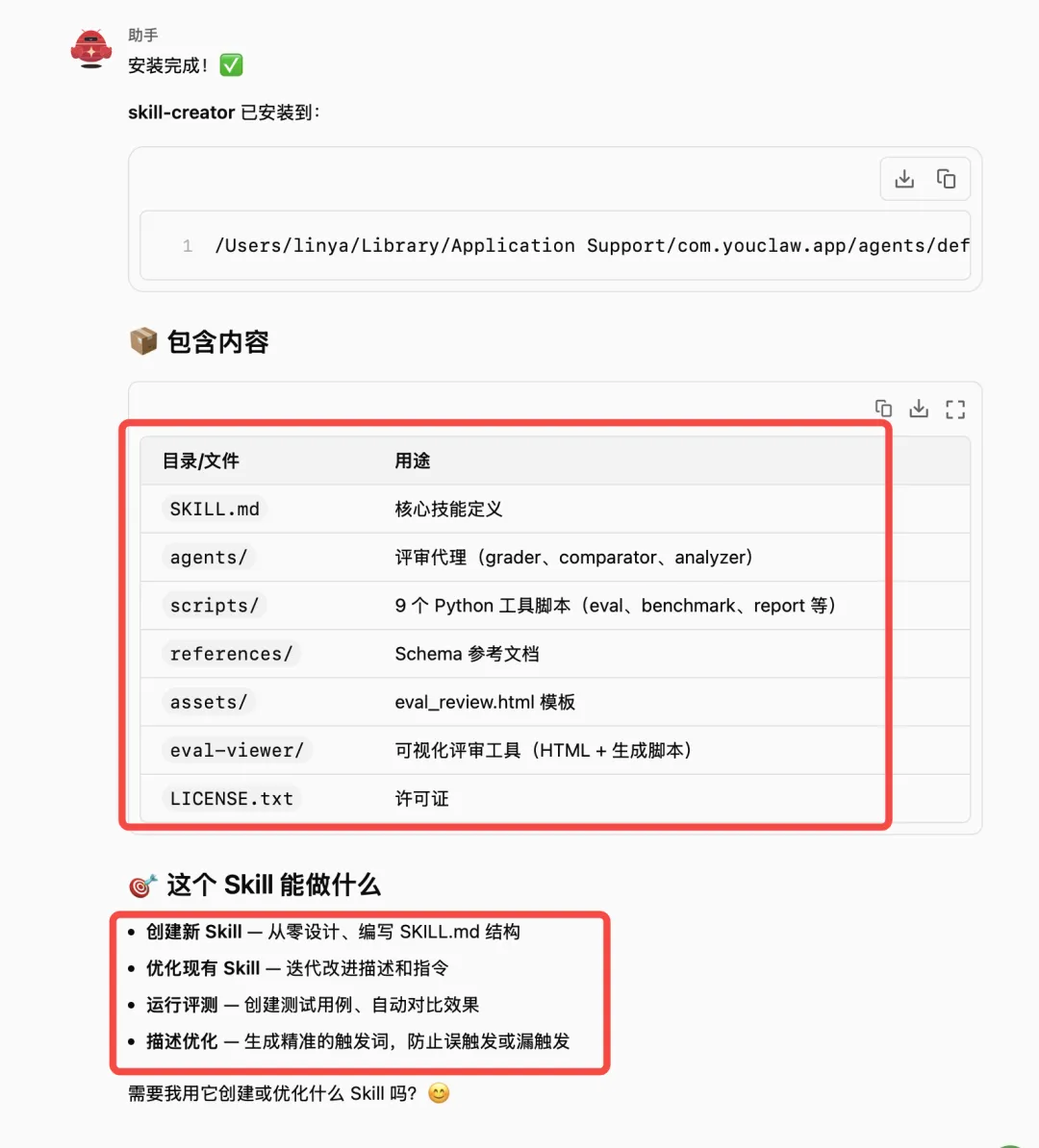 很快,Youclaw 就自动为你生成了一个Skill,还会告诉你 Skill 结构,说明和测试用例。