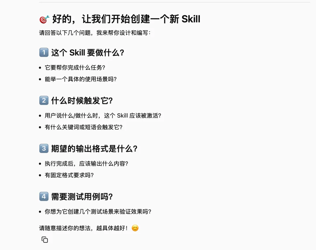 不是让你劈里啪啦敲一堆复杂的代码或提示词。它会极其聪明地甩出 4 个核心问题来引导你:这个 Skill 要做什么?什么时候触发?期望的输出格式是什么?需要测试用例吗?