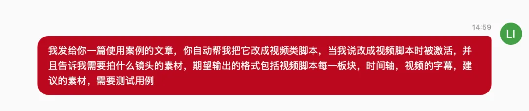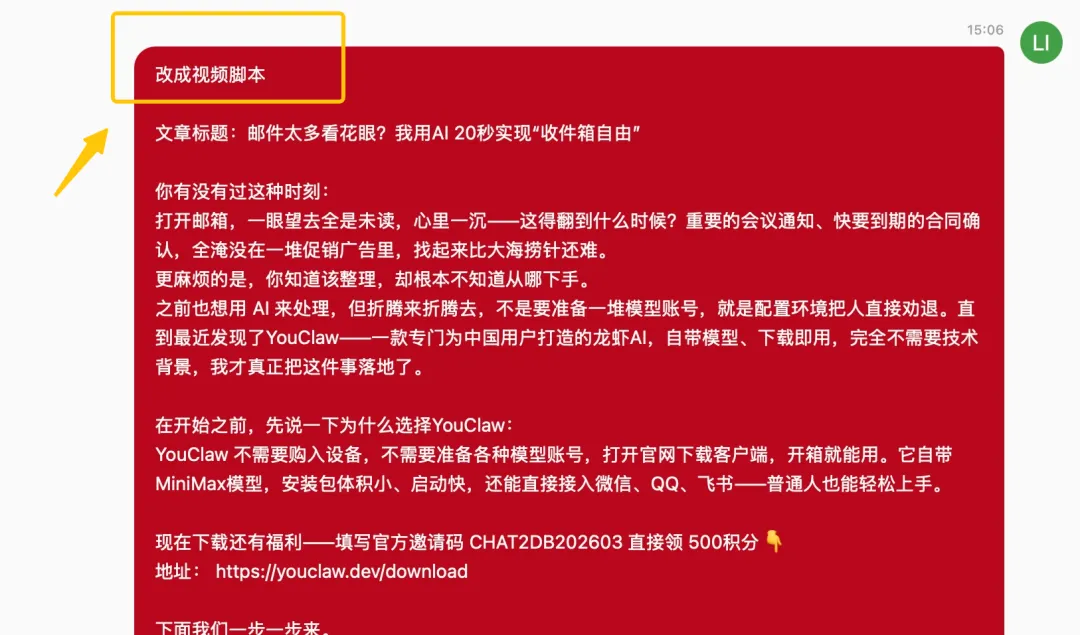 技能做好了,测试一下效果。 我直接把以前写过的一篇文章发给它,并输入触发词:“改成视频脚本”。