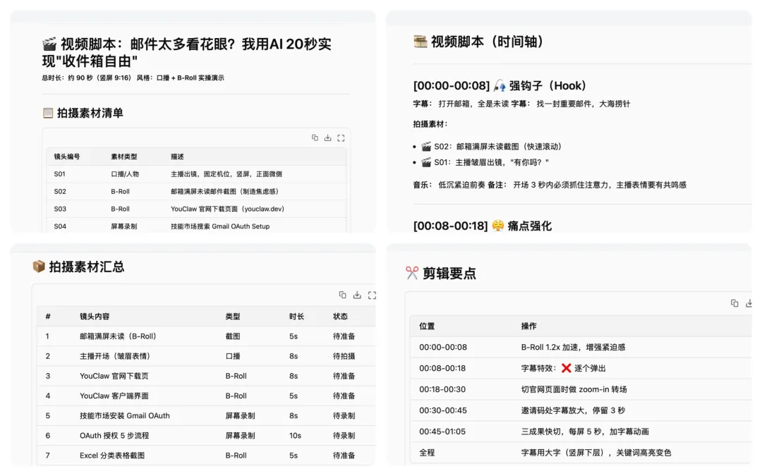 瞬间,一份极其详尽的短视频脚本生成了,不仅条理清晰,细节更是拉满:包括拍摄素材清单、视频脚本、素材汇总、剪辑要点四方面。