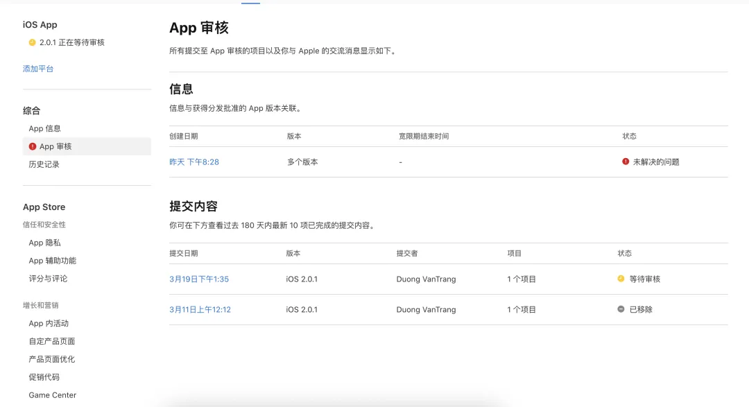 版本号 「2.0.1」 赫然显示「正在等待审核」,却多了 「未解决的问题」