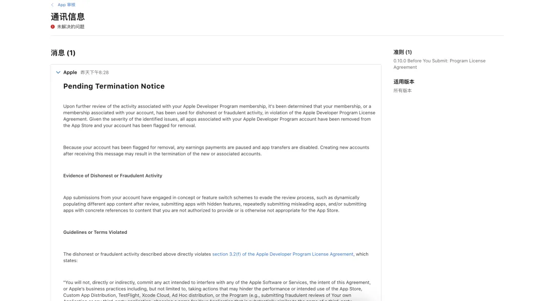 当你点开那条红色预警,你会看到一封让开发者脊背发凉的邮件:「《Pending Termination Notice》(待终止通知)」
