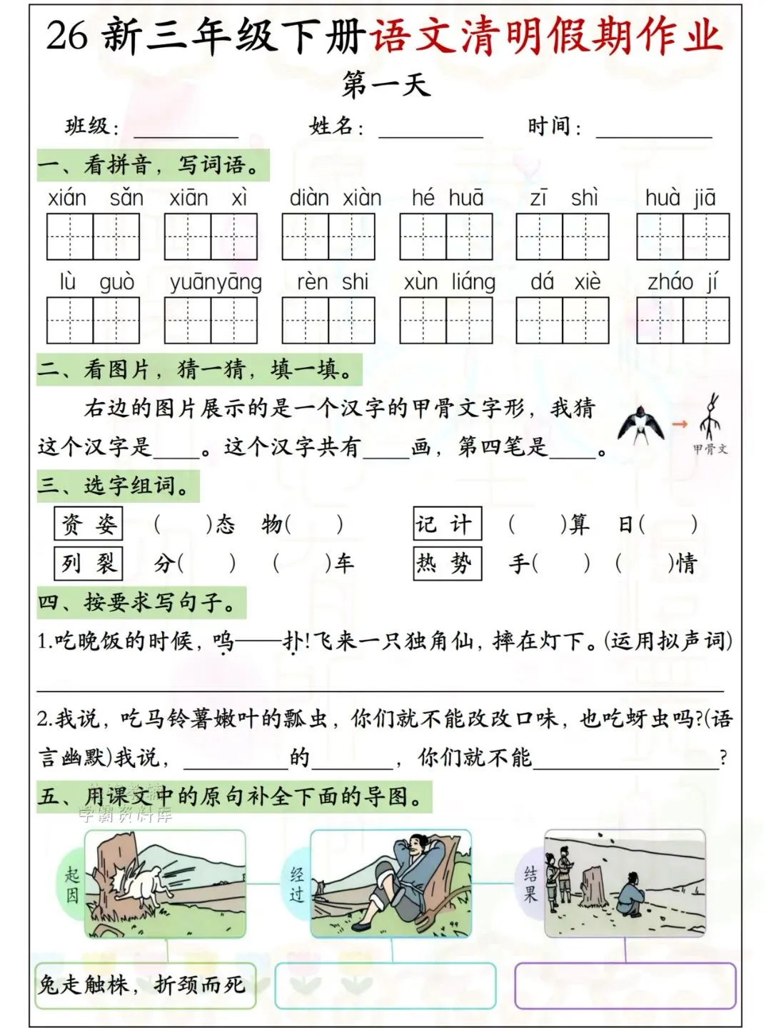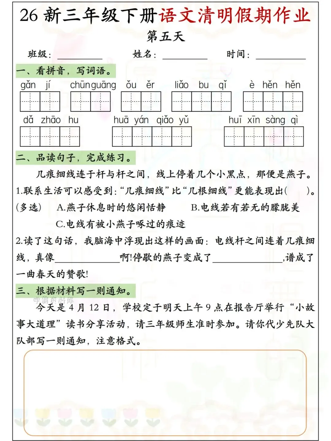 26新三年级下册语文清明假期作业 电子版可下载可打印