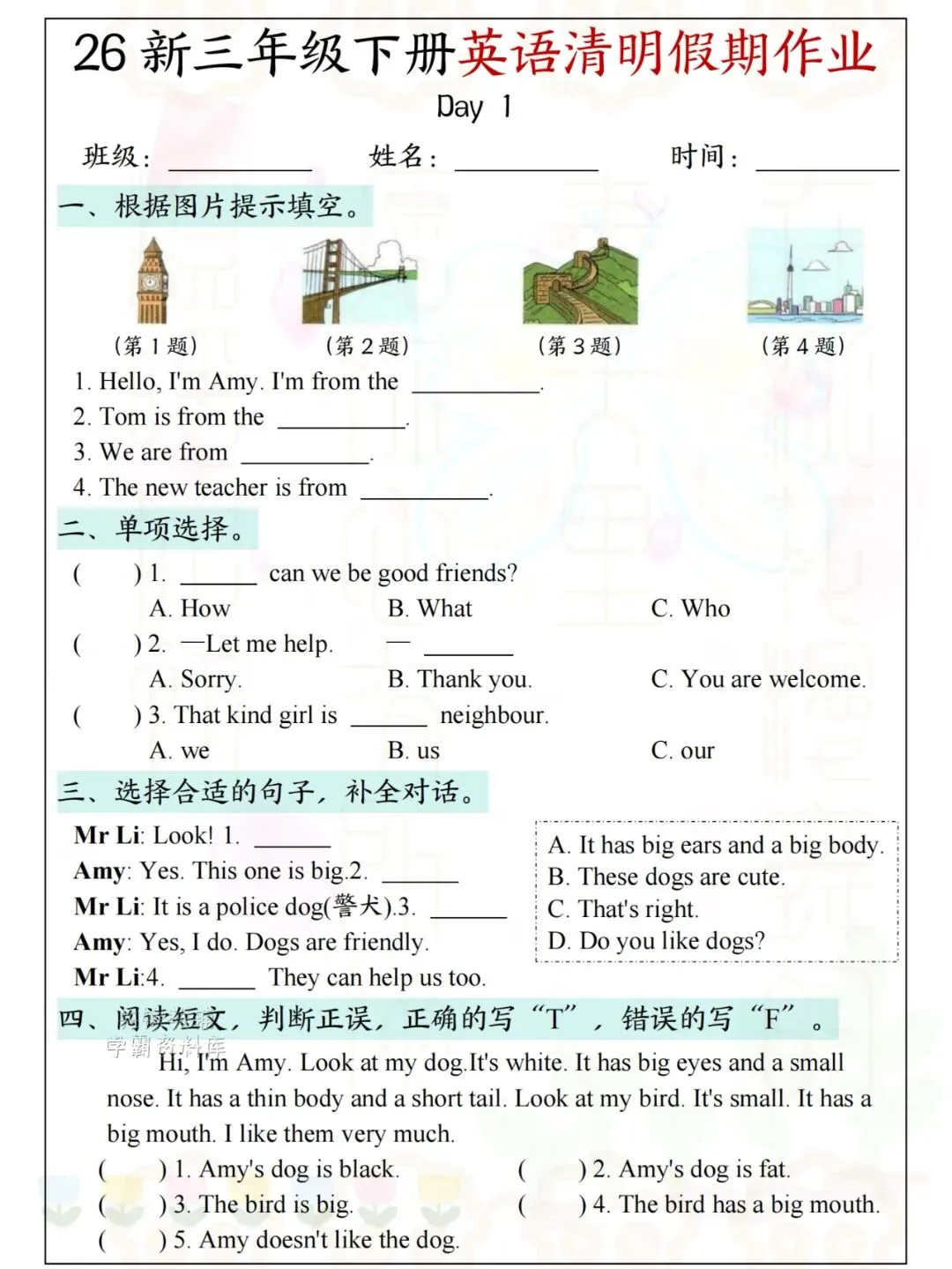 26新三年级下册英语清明假期作业 电子版可下载可打印