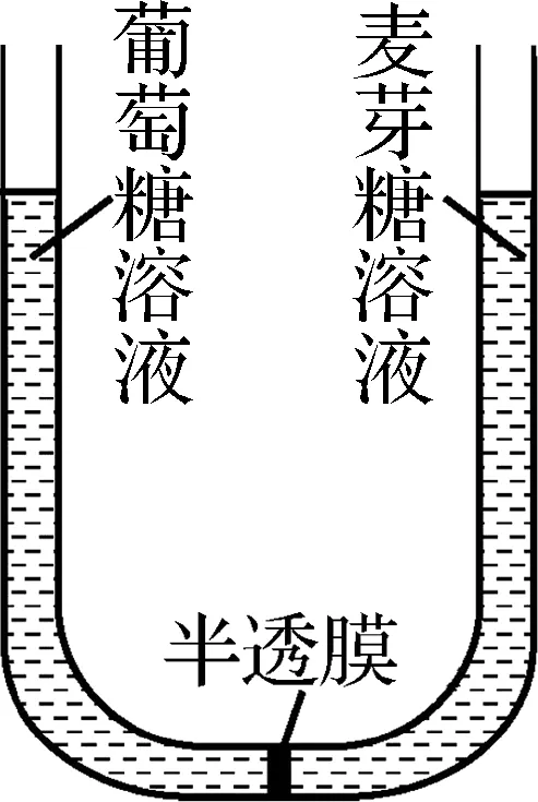 1. 在如图U型管的左右管内分别装入质量分数相等的葡萄糖、麦芽糖溶液。初始时两管中液面相平,假设溶质分子不能透过半透膜。判断下列情况中液面的变化: