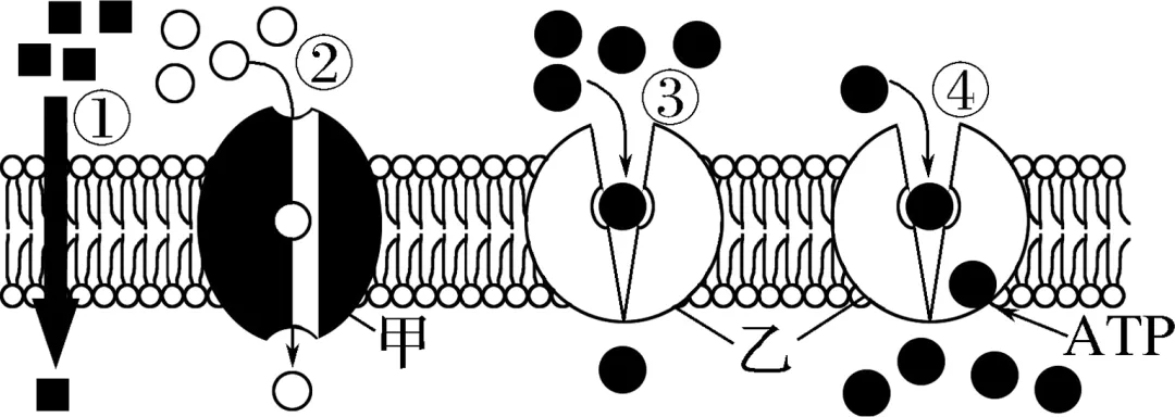 3. 下图中甲为通道蛋白,乙为载体蛋白。其中,自由扩散为①(填序号,下同),协助扩散为②③,主动运输为④。