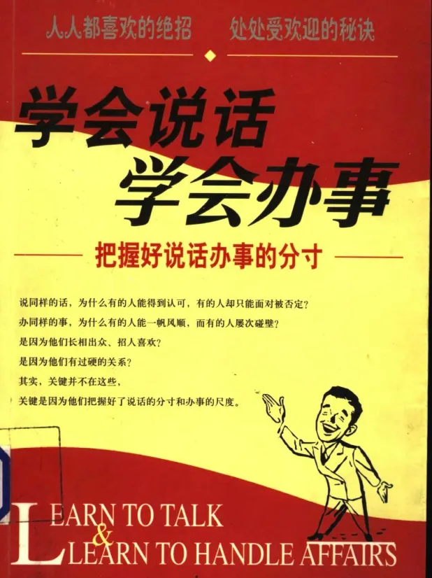 《学会说话 学会办事》是由冀衡编著、中国商业出版社于2004年2月出版的心理自助类实用读物,全书366页,定价24.80元,是一本不讲空泛理论、全是可直接套用实战技巧的处世指南。该书围绕”说话有分寸、办事有尺度”这一核心理念展开,深入剖析了人际交往中最关键的两大能力——语言表达与事务处理,通过大量生活化案例揭示了一个普遍现象:说同样的话,为什么有的人能得到认可,有的人却只能面对被否定?办同样的事,为什么有的人能一帆风顺,而有的人屡次碰壁?作者指出,问题的关键并不在于长相、背景或关系,而在于是否精准把握好了说话的分寸感和办事的尺度感。书中系统传授了如何拒绝别人而不伤和气、如何说服别人而让对方心悦诚服、如何批评与赞美才能达到预期效果、如何摆脱尴尬局面并化险为夷、如何在职场中运用恰当的说话技巧与办事心法等具体方法,帮助读者在不同场合做到精准表达、灵活应变。这本书的价值在于它将复杂的社交艺术拆解为可学习、可练习、可复制的操作步骤,让读者能够将零散的经验转化为系统的处世能力,无论是初入职场的年轻人、需要拓展人脉的创业者,还是在日常生活中希望改善人际关系的普通读者,都能从中获得一套实用的行为框架,凭借驾驭谈吐和办事的能力,给自己创造一个融洽的社交环境,赢得一片任意驰骋的发展空间,最终实现从社交焦虑到从容自信的转变,让说话成为连接人心的桥梁,让办事成为成就事业的阶梯。
