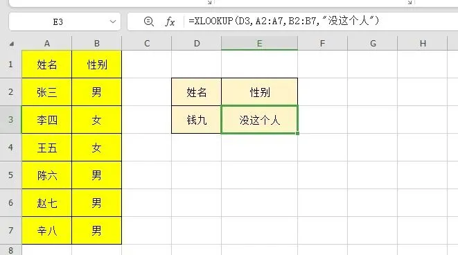 =XLOOKUP(D3,A2:A7,B2:B7,”没这个人”)