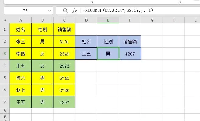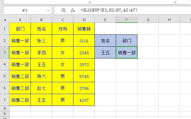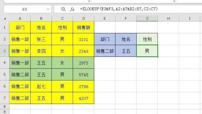 查找姓名同时返回性别和销售额,不用再像VLOOKUP那样,需要设置第3个参数用COLUMN来动态获取。